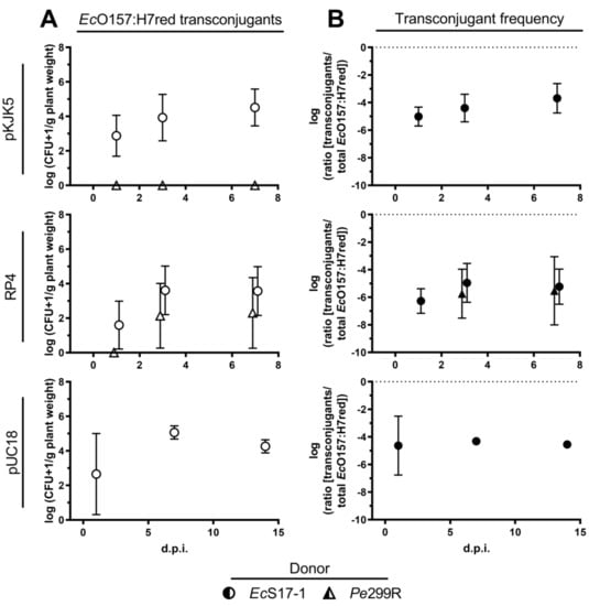Conjugation dynamics of transconjugant EcO157:H7red on gnotobiotic A. thaliana. (A) Population development of transconjugant EcO157:H7red after co-inoculation with donors EcS17-1 (circles) and Pe299R (triangles) harbouring pKJK5 (top), RP4 (middle), and pUC18 (bottom) onto gnotobiotic A. thaliana after 1, 3, and 7 d.p.i. (B) Frequency of EcO157:H7red transconjugants in the recipient population after co-inoculation with donors EcS17-1 (circles) and Pe299R (triangles) harbouring pKJK5 (top), RP4 (middle), and pUC18 (bottom) onto gnotobiotic A. thaliana after 1, 3, and 7 d.p.i. The conjugation with Pe299R (pKJK5) did not yield transconjugants above the limit of detection. Error bars represent the standard deviation of the mean.