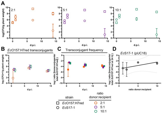 EcS17-1 was able to transfer the mobilisable plasmid pUC18 to EcO157:H7red on A. thaliana. When co-inoculated for 24 h with EcS17-1 (pUC18), on average, 103 EcO157:H7red (pUC18) transconjugants g−1 plant were detected, reaching a maximum of ≈105 transconjugants g−1 plant 7 d.p.i. (Figure 4A, bottom). The average frequency of EcO157:H7red (pUC18) transconjugants reached 10−4 per recipient cell after 7 days and did not decrease within 14 days, despite the lack of selective agents (i.e., antibiotics) and a potential fitness cost of the plasmid (Figure 4B, bottom).