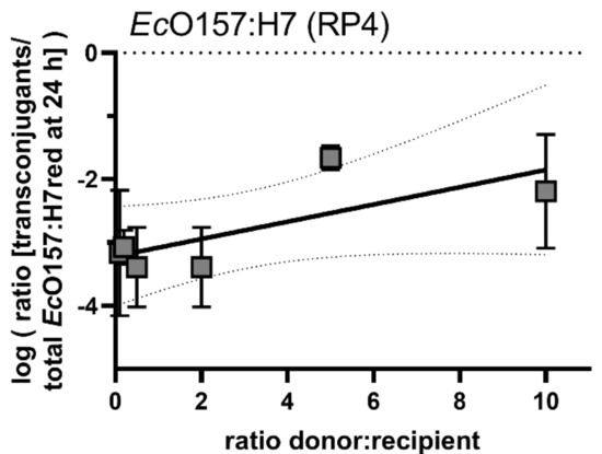 Conjugation dynamics of the self-transmissible plasmid RP4 after inoculating different densities of donor EcO157:H7 with the recipient EcO157:H7red. Shown are transconjugant frequencies of different donor/recipient ratios after 24 h. No significant differences in the conjugation efficiency after treatments with different EcO157:H7 donor concentrations could be detected. A linear regression was fitted (r2 = 0.55, broken lines 95% confidence intervals of the linear regression). Error bars represent the standard deviation of the mean.