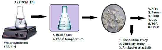 A physician normally describes an antibiotic with an analgesic/antipyretic drug and the usual practice of simultaneous oral administration. Therefore, in the current study, an attempt has been made to synthesize cocrystal (AZT-PCM) system by solvent evaporation method. The possible intermolecular interactions and chemical compatibility of APIs was studied by Fourier transform infrared (FTIR), Raman spectroscopy and differential scanning calorimeter (DSC) techniques. New crystalline phase and thermal stability of the product were confirmed by powder X-ray diffraction (PXRD) and thermo gravimetric analysis (TGA), respectively. The molar ratio of components in the final product was confirmed by high-performance liquid chromatography (HPLC). Dissolution rate and antibacterial activity of cocrystals were studied and results were compared with raw azithromycin dihydrate (AZT DH) to evaluate its pharmaceutical applicability. The overall scheme of the study is given in Figure 2.