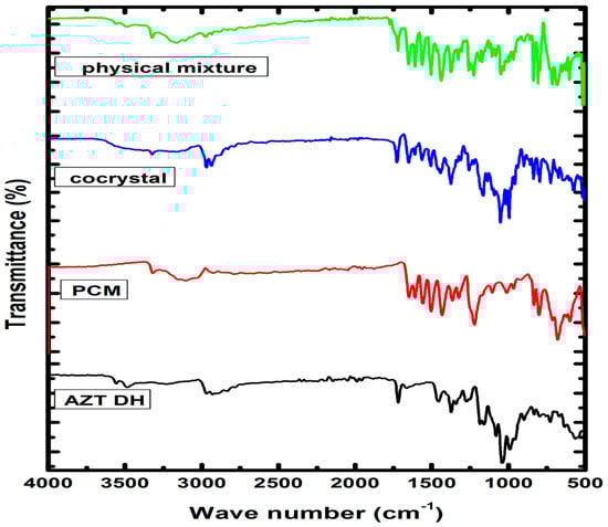 FTIR spectra of AZT DH, PCM, cocrystal and physical mixture.