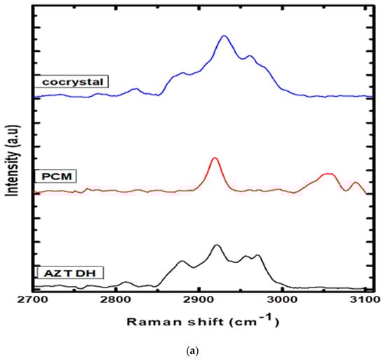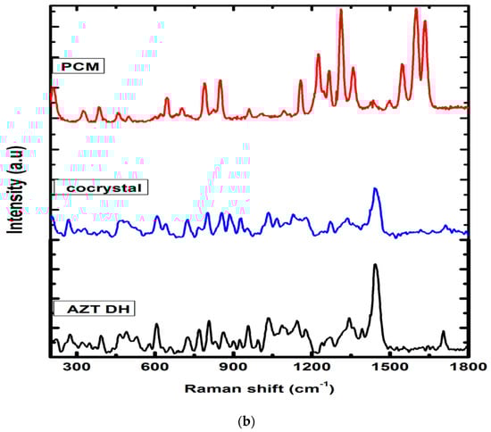 (a) Raman spectra of AZT DH, PCM and cocrystal range (2700–3100 cm−1). (b) Raman spectra of PCM, AZT DH and the cocrystal range (500–1750 cm−1).