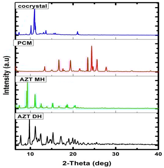 For detailed structural information, crystals with appropriate dimensions and size have to be prepared, which is often a hectic task and fails in many instances. Another limitation of single crystal analysis is that the selected crystal may represent a side product, not the desired polycrystalline product (bulk). Moreover, single crystal analysis is time consuming and not a readily available technique. Conversely, PXRD is a readily available technique generally used for confirmation and determination of bulk purity and crystallinity of the bulk material [56]. The DH form of AZT was re-crystalized from the same solvent system used in the preparation of cocrystals and subjected to PXRD analysis along PCM and cocrystals. Although the authentic data about cocrystals can be obtained from single crystal XRD diffractogram, in some cases where the crystal obtained is not suitable for single crystal XRD analysis, PXRD analysis is preferred to get the data about the crystals formed [57]. Referring to the study of Wu et al. [57], PXRD analysis has been used in this study to confirm the crystallinity of the product formed. Before the PXRD measurement, we crushed the single crystals formed to eliminate the effects of preferential orientation and enhance the clarity of the small diffraction peaks [57]. New solid phases were identified as changes were observed in the PXRD pattern, by comparing the starting material and final product [58]. The PXRD diffractograms of the prepared cocrystal and raw materials are given in Figure 5. The diffractograms of pure AZT and recrystallized AZT exhibited DH and MH forms, respectively which showed good agreement with previously reported experimental PXRD patterns [57]. The diffraction pattern of the cocrystal exhibited different pattern to that of starting materials and recrystallized AZT MH. The different PXRD patterns of cocrystals in comparison with the starting precursors indicate that the new crystalline phase material has been successfully formed with a different crystalline phase [57,59].