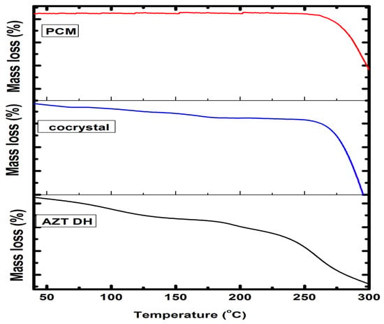 Previously compiled data revealed that AZT DH transformed to MH, followed by anhydrous form up to its melting temperature [65]. Similarly, the weight loss of cocrystal up to onset temperature attributed to the removal of unbound or bound (solvate) molecules from cocrystals [57]. Temperature above the melting point causes the degradation of cocrystals [66]. Therefore, the weight loss of AZT-PCM cocrystals before onset temperature may be due to the loss of water molecules from cocrystals or residual solvent elimination or water absorbed by the samples, while weight loss starting from 240 °C is due to degradation. Little weight loss was also observed after melting temperature and before degradation, which may be due the volatilization of components of the cocrystal.