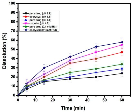 The in vitro drug release studies of AZT DH and the prepared cocrystal were performed in phosphate buffer (pH 6.8), acetate buffer (pH 4.5) and 0.1 mM HCl. The result displayed in Figure 8 reveals that cocrystal exhibited a better dissolution rate than pure AZT DH. Due to agglomeration and poor wettability, pure AZT DH showed poor dissolution up to one hour [21]. However, the better dissolution performance of the resulting cocrystal can be traced to changes in size, shape, crystalline pattern [57] and hydrophilic nature of PCM [36].