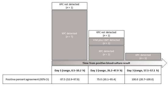 T2Resistance™ panel results for 13 whole blood samples from patients with carbapenemase-producing Klebsiella pneumoniae (n = 12) or Citrobacter freundii (n = 1) BSIs stratified according to the time from a positive BC result. Eleven samples were positive for a carbapenemase (10 KPC and 1 VIM) β-lactamase gene, whereas one sample was also positive for an AmpC (CMY) β-lactamase gene.