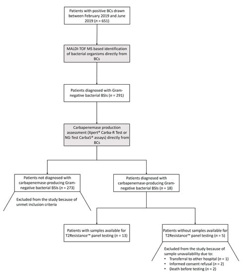 Between February 2019 and June 2019, K2 EDTA-treated whole blood samples were collected and processed with the T2Resistance™ panel in the clinical microbiology laboratories of two Italian University hospitals (Fondazione Policlinico Universitario A. Gemelli IRCCS of Roma and Ospedale Santa Maria della Misericordia of Perugia). Samples were from patients hospitalized in intensive care units, infectious disease clinics, or hematology wards, who had a laboratory diagnosis of carbapenemase-producing Gram-negative bacterial BSI (see below). The patient/sample selection process, starting from patients who were diagnosed with Gram-negative bacterial BSIs during the study period, is depicted in Figure 2. To obtain a maximum number of samples to test in a five-month period, we did not use a pre-specified window for sample collection. The time elapsing from diagnosis to T2Resistance™ panel sampling/testing ranged from 0.5 h to 57.1 h (i.e., within 3 days), depending on the actual operational hours of the laboratories (e.g., falling on holiday weekends). However, for the majority of samples, this range fell within the time (i.e., 36 h) in which a positive T2MR® based assay result was expected [23].