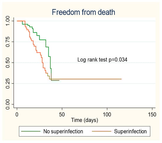 Finally, the survival of patients with bacterial superinfection was described using the Kaplan–Meier method, with death as the event of interest. The log-rank test was used to establish differences in survival. All statistical analyses were performed using Stata® v16 software (StataCorp., College Station, TX, USA).