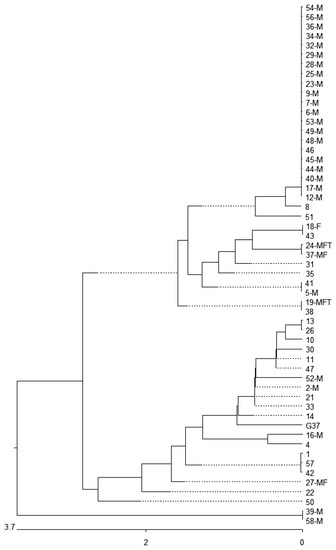 In addition to their importance for the interpretation of M. genitalium-positive follow-up tests, genotyping results provide interesting aspects regarding the circulation of distinct types in human populations. In the present study, more than one-third of strains could be assigned to mgpB type 4 in cluster 1 (all of them found in MSM) and this type is disproportionately associated with macrolide resistance. Despite the low rate of non-MSM with a confirmed mgpB type among the patients (n = 8, 13.8%), one of two women who have sex with men (WSM) and the men who have sex with women (MSW) belonged to cluster 2 (exception: woman #35), supporting the hypothesis of a largely independent circulation of genotypes in both groups. This was also shown in a recent study [27]. After the investigation of strains sampled between the years 2014 and 2016 in Dresden (31.6%) and between 2017 and 2018 in Berlin (38.6%), type 4 was also the most common mgpB type [21,28]. Furthermore, the results of reports from France and Spain demonstrated rates of type 4 strains of 23.8% and 27.8%, respectively [20,27]. All these studies included a high percentage of MSM. In contrast, the frequency of genotype 4 strains remains relatively low (<7%) if populations with presumably low rates of MSM are analyzed, as shown in Australia, South Africa and Spain [29,30,31]. The findings suggest an increased circulation of mgpB type 4 among MSM, at least in Europe, which is linked to a high rate of macrolide resistance. However, the rate of macrolide-resistant strains in the present study (56.9%) was lower in comparison with that found in Berlin [25]. Further nationwide studies are necessary to substantiate this preliminary result. Nevertheless, it can be assumed that the occurrence of M. genitalium strains among carriers with a particular preferred sexual behavior is polyclonal and appears to be different to that of other populations. In combination with a high rate of the prescription of macrolides among (HIV-positive) MSM, the genotypes in this specific group tend to demonstrate a higher rate of resistance to azithromycin. At this stage, it remains unclear if the predominance of mgpB type 4 among MSM is the result of easier transmission during anal intercourse [20] or of the limited connectivity between the sexual networks of MSM and WSM/MSW [27].