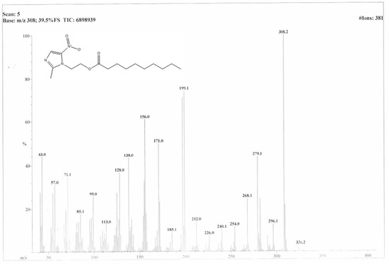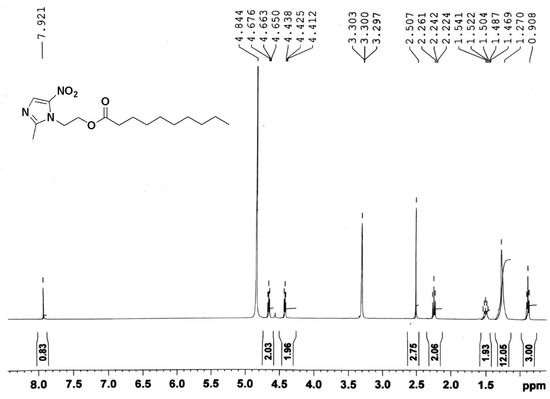 Synthesis of DC-Met-10 as outline in below was carried out by using a vigorously stirred solution of Metronidazole (500 mg; 2.921 mmol) in 25 mL acetone, refluxed at 60 °C for 30 min, followed by adding decanoyl chloride (0.62 mL; 3 mmol). Next, it was refluxed further for 10 h with constant stirring (Scheme 1). The progression of the reaction was monitored by thin-layer chromatography (TLC). After complete consumption of the starting material, the solvent was evaporated from the reaction mixture after cooling to room temperature. After removing the excess solvent, the reaction mixture was poured into chilled distilled water. The aqueous part was extracted with n-hexane (3 × 25 mL), the organic portions were combined, excess hexane was removed through rotary evaporation, and the product was purified by silica gel chromatography with an 8:2 (n-hexane: ethyl acetate) solvent system to obtain gummy liquid with a yield of 76% (Scheme 1). 1H-NMR (MeOD) ppm: 0.90 (t, 3H, CH3, j = 4 Hz), 1.26–1.28 (m, 12H, CH2), 1.46–1.54 (m, 2H, CH2), 2.2 (t, 2H, CH2-CO, j = 7.2 Hz), 2.50 (s, 3H, Heterocyclic CH3,), 4.42 (t, 2H, CH2-N, j = 5.2 Hz), 4.66 (t, 2H, CH2-O, j = 5.2 Hz), 7.92 (s, 1H, heterocyclic proton). Using EI-MS, the resultant ion peak appeared at 326.2 m/z.