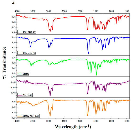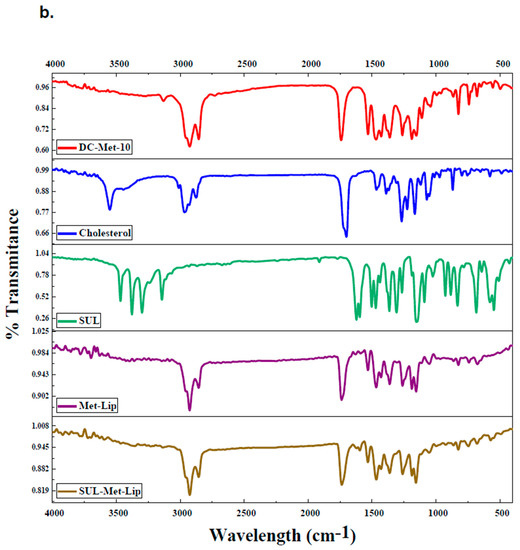 FTIR of pure Moxifloxacin (Mox), Sulfamethoxazole (Sulp), cholesterol, synthesized amphiphilic molecule (DC-Met-10), and both drug-loaded niosomal formulations (Mox-Met-Lip and Sul-Met-Lip) and also without drug vesicles (Met-Lip) were analyzed and summarized (Figure 4a,b) [29]. In comparison to the drug alone, drug-loaded niosomes showed a slight deviation in IR frequencies, which was due to the induction of secondary interactions posed by non-ionic surfactants (Figure 4a). A broad peak pattern of the hydroxyl group (−OH) appeared at around 3200 cm−1 to 3500 cm−1 in Mox-Met-Lip, whose pattern did not appear in any other spectra. Moreover, drug peaks near 1600–1750 cm−1 of C=C and C=O were found to be suppressed in Mox-Met-Lip, which shows that the peaks had been enhanced in Mox-Met-Lip due to the presence of DC-Met-10 and cholesterol (Figure 4a).
