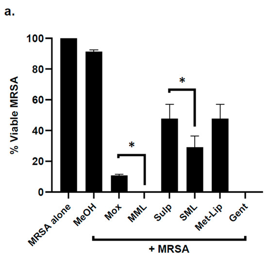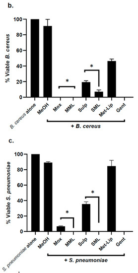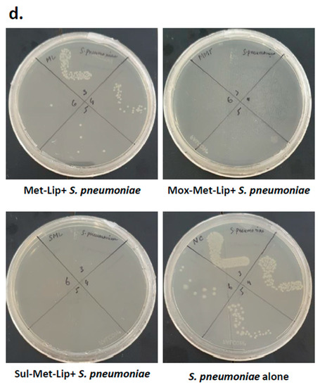 Drug-loaded nanocarriers presented significant antibacterial activity against Gram-positive clinical isolates. In brief, drugs and drug-loaded nanocarriers were incubated with one million bacteria at 37 °C for 2 h, as defined in Materials and Methods. The results showed that drugs and drug-loaded nanocarriers revealed important bactericidal activity against the Gram-positive bacteria. (a) When tested against MRSA, (b) against B. cereus, (c) S. pneumoniae and (d) illustrative effects of S. pneumoniae. Where MeOH represents methanol, Mox represents Moxifloxacin, MML stands for Moxifloxacin-loaded metronidazole liposomes, Sulp stands for Sulfamethaxazole, SML represents Sulfamethaxazole-loaded metronidazole liposomes, Met-Lip indicates metronidazole liposomes, and Gent represents Gentamicin. The data are expressed as the mean ± standard error of three independent experimentations performed in duplicate, where (*) represents when p ≤ 0.05.