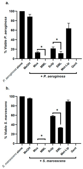 Several MDR bacteria were used, including Gram-positive (methicillin-resistant S. aureus (MRSA), B. cereus, and S. pneumoniae) and Gram-negative (P. aeruginosa, S. marcescens, S. enterica, and K. pneumoniae) (Table 1). All bacterial isolates were from clinical samples. These bacteria were grown aerobically in nutrient broth (NB) at 37 °C overnight preceding experiments, as previously depicted [22,23].