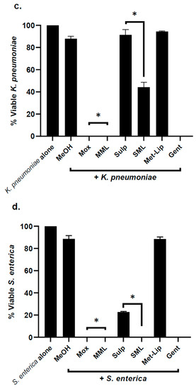 Bactericidal assays were performed to determine the efficacy of drugs and drug-loaded nano-formulations against MDR bacteria [22,23]. Briefly, drugs alone, nanocarriers alone, and drug-loaded nanocarriers were kept with 1 × 106 bacteria for 2 h at 37 °C. Next, ten-fold serial dilutions were accomplished with plating on nutrient agar plates. Plates were kept overnight at 37 °C. Finally, colonies were counted to estimate viable bacterial colony-forming units (c.f.u). For negative controls, bacteria were cultured alone in phosphate-buffered saline (PBS), while for the positive control, bacteria were treated with gentamicin (100 µg/mL).