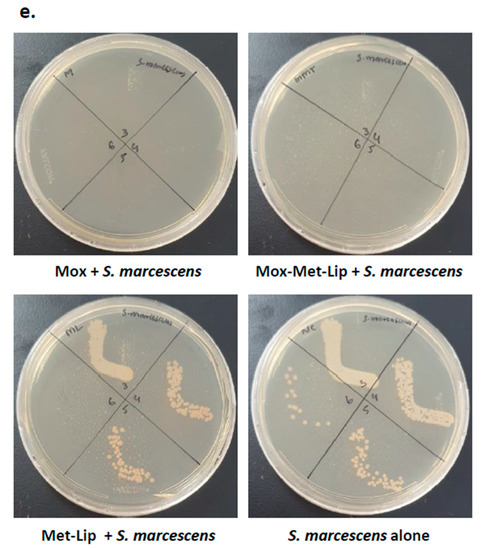 Drugs and their nanocarrier counterparts abolished Gram-negative bacteria. Briefly, bacteria (1 × 106) were challenged with drugs and drug-loaded formulations for 2 h at 37 °C. Drugs and drug-loaded nanocarriers showed excellent antibacterial effects against Gram-negative bacteria. (a) When tested against P. aeruginosa, (b) against S. marcescens, (c) K. pneumoniae, (d) S. enterica and (e) illustrative effects of S. marcescens. Where MeOH represents methanol, Mox represents Moxifloxacin, MML stands for Moxifloxacin-loaded metronidazole liposomes, Sulp stands for Sulfamethaxazole, SML represents Sulfamethaxazole-loaded metronidazole liposomes, Met-Lip indicates metronidazole liposomes, and Gent represents Gentamicin. The data are expressed as the mean ± standard error, where (*) represents when p ≤ 0.05.