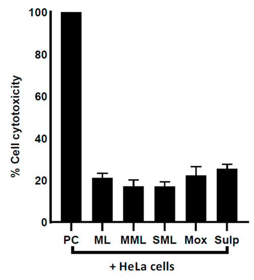 Drugs and drug-loaded nanocarriers demonstrated slight cytotoxic effects against HeLa cells. Human cells were grown in 96-well plate up to 80–90% confluency, as discussed in Materials and Methods. Next, cell monolayer was treated with drug–nanocarrier combinations overnight at 37 °C with 5% CO2 and 95% humidity. Where ML indicates metronidazole liposomes, MML stands for Moxifloxacin-loaded metronidazole liposomes, SML represents Sulfamethaxazole-loaded metronidazole liposomes, Mox represents Moxifloxacin, Sulp stands for Sulfamethaxazole, and PC represents positive control. The data are expressed as mean ± standard error. Data were analyzed using Graph Pad Prism software (8.0.2).