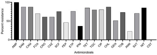 Susceptibility to 20 antimicrobials (AMs) of 8 functional groups: beta-lactams (ampicillin, ampicillin-sulbactam, cefuroxime, cefoxitin, ceftriaxone, ceftazidime, cefoperazone-sulbactam, cefepime, ertapenem, imipenem), tetracyclines (tetracycline, tigecycline), fluoroquinolones (ciprofloxacin), phenicols (chloramphenicol), aminoglycosides (gentamicin, tobramycin, amikacin), sulfonamides (trimethoprim-sulfamethoxazole), nitrofurans (nitrofurantoin), and polymyxins (colistin) were determined using Vitek-2 Compact (BioMerieux, Paris, France). The results were interpreted according to the European Committee on Antimicrobial Susceptibility Testing, Version 11.0, 2021 (http://www.eucast.org access date 8 August 2021). Reference strains Escherichia coli ATCC 25922 and ATCC 35218 were used as quality controls. The isolates were categorized as resistant (R), multidrug-resistant (MDR), or extensively drug-resistant (XDR) according to the criteria proposed by Magiorakos et al. [11].