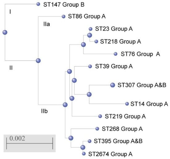 The phylogenetic tree was constructed on the base of combined gene sequences of MLST profiles; two clusters were revealed. Cluster I consisted of one ST147 referring to one isolate not associated with severe manifestations of systemic infections (Group B). Cluster II included two sub-clusters: IIa consisting of one ST86 associated with a pronounced systemic inflammatory response (Group A); IIb consisting of 10 genetic lineages including 8 sequence types (ST14, ST23, ST39, ST76, ST218, ST219, ST268, and ST2674) referred to the strains of Group A, and 2 sequence types (ST307 and ST396) including isolates both Group A and Group B (Figure 2).