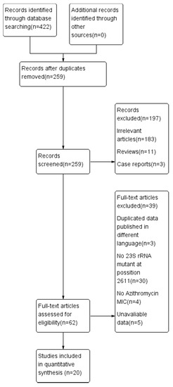 A total of 422 potentially relevant abstracts were identified, of which 259 were duplicates and thus removed. The remaining 259 abstracts were assessed; 197 of them were irrelevant articles, reviews, and case reports and were subsequently excluded. The remaining 62 full-text articles were assessed for eligibility and 42 of them were excluded because they consisted of duplicated data published in a different language, or they did not indicate azithromycin MICs or the 23S rRNA mutant at position 2611. There were 20 studies that met the inclusion criteria for the meta-analysis [15,16,17,18,19,20,21,22,23,24,25,26,27,28,29,30,31,32,33,34] (Figure 1). The data and characteristics of the 20 studies are summarized in Table 2 and Table 3.