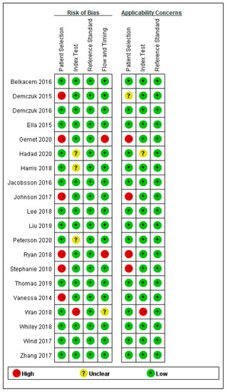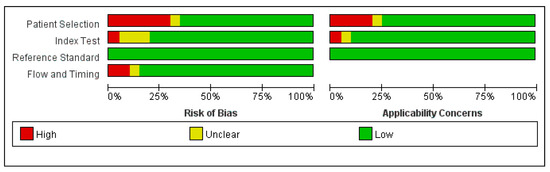 - Whiting, P.F.; Rutjes, A.W.; Westwood, M.E.; Mallett, S.; Deeks, J.J.; Reitsma, J.B.; Leeflang, M.M.; Sterne, J.A.; Bossuyt, P.M. QUADAS-2: A revised tool for the quality assessment of diagnostic accuracy studies. Ann. Intern. Med. 2011, 155, 529–536. [Google Scholar] [CrossRef] [PubMed]
