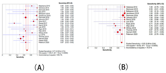 Forest plots for the combined sensitivity from included studies. (A) The group with moderate resistance limited to 2–128 mg/L. (B) The group with moderate resistance limited to 4–128 mg/L.