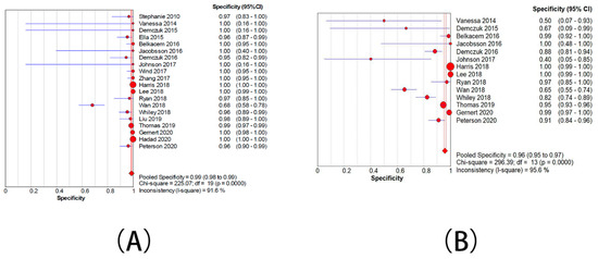 Forest plots for the combined specificity from included studies. (A) The group with moderate resistance limited to 2–128 mg/L. (B) The group with moderate resistance limited to 4–128 mg/L.