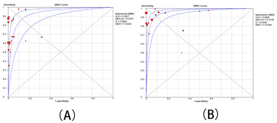 sROC curve of fourteen studies with both sensitivity and specificity rates. (A) The group with moderate resistance limited to 2–128 mg/L. (B) The group with moderate resistance limited to 4–128 mg/L. Q* defined by the point where sensitivity and specificity are equal.