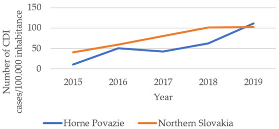 The purpose of the paper was also to identify the presence of hypervirulent strains, such as RT176 and RT027. The RT027 strain is referred to as C. difficile BI/NAP1/027 in the studied sample and the circulation of ribotypes among departments of in- and out-patients was monitored [15]. In a recent extensive study [16], it was shown that the effect of individual ribotypes on overall disease progression, mortality and biomarkers varied. In addition to C. difficile PCR ribotype 027, there are other strains that are associated with epidemics and a severe course of C. difficile infection. Despite the increased virulence of certain ribotypes, the PCR ribotype value as a predictor of disease severity is limited because the ribotype involved in the infection is not known until it is diagnosed. However, in epidemics, the ribotype could be considered when deciding on the choice of empirical treatment [10]. According to the data reported to the Epidemiological Intelligence Information System (EPIS) in the Horne Povazie region of northern Slovakia, the incidence of reported CDI cases had increased. In 2015, there were four patients/10,000 population reported. In 2017, the incidences doubled and, in 2018, the incidences increased up to 10 per 10,000 inhabitants. In 2019, this number remained approximately on the same level with 10.2 CDI patients per 10,000 inhabitants. About 84% of CDI patients were hospital-associated infections (HAI-CDI), and 16% of CDI patients were community associated (CA-CDI). In 2019, HAI-CDI cases from internal medicine, long-term care, intensive care unit, surgery, infectious diseases, and other wards were reported in Slovakia in 2019 (in a population of 100,000)—Figure 1. This increased incidence rate lies also in the higher testing rate and conscientious reporting to the Epidemiological Information System (EPIS) since 2016.