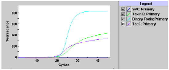 - Reigadas, E.; Alcalá, L.; Valerio, M.; Marín, M.; Martin, A.; Bouza, E. Toxin B PCR cycle threshold as a predictor of poor outcome ofClostridium difficileinfection: A derivation and validation cohort study. J. Antimicrob. Chemother. 2016, 71, 1380–1385. [Google Scholar] [CrossRef] [Green Version]