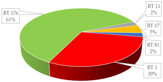 Due to the severe course of the disease, the C. difficile isolates were further analyzed by PCR capillary-based electrophoresis ribotyping. In the studied samples, five (5) different ribotypes of C. difficile isolates were revealed (RT001, 011, 017, 081, 176), which were identified by PCR ribotyping. The proportion of C. difficile in 44 isolates was: RT176 (n = 27; 69.5%), RT001 (n = 13; 23.7%), RT011 (n = 1; 1.7%), RT081 (n = 1; 1.7%), RT017 (n = 2; 3.39%)—Figure 3.