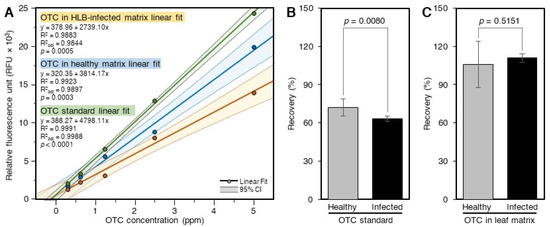 Recovery of OTC from spiked citrus leaves. (A) Standard curves of OTC in 60% methanol and citrus leaf extract of healthy and ‘Ca. L. asiaticus’-infected plants. The standard curves were prepared in the sample matrix by spiking the leaf extracts with OTC and then passing them through SPE. (B) Recovery of OTC from spiked ‘Ca. L. asiaticus’-infected and healthy leaves as calculated using the pure standard. (C) Recovery of OTC from spiked ‘Ca. L. asiaticus’-infected and healthy leaves as calculated using the standards prepared in the sample matrices and cleaned by SPE. Data are the means ± SD of five replicates (n = 5). Values with p-values < 0.05 are significantly different using a two-tailed student t-test.