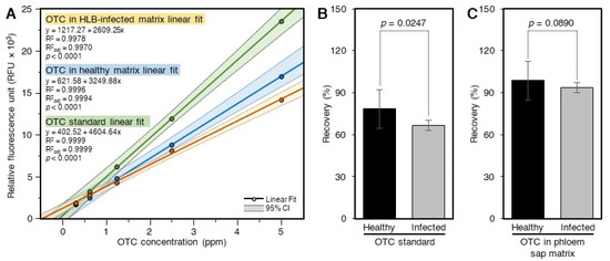 The standard curve was prepared in the citrus sap and analyzed directly without SPE. Briefly, 50 µL of the citrus sap was mixed with 50, 25, 12.5, or 6.2 µL of 200 ppm OTC standard, and the final volume was completed to 2 mL using 60% methanol. The pure OTC standard was prepared in 60% methanol. To determine the percent (%) recovery, the phloem or the xylem sap was spiked with 25 µL of 200 ppm OTC standard and analyzed in the same way.
