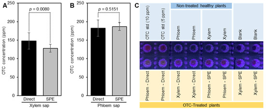 Determination and visualization of OTC in the phloem and xylem saps of OTC-treated plants. (A) The level of OTC in the xylem sap as measured using the direct method (without SPE) and after SPE. (B) The level of OTC in the phloem sap as measured using the direct method (without SPE) and after SPE. Data are the means ± SD of five replicates (n = 5). Values with p-values < 0.05 are significantly different using a two-tailed student t-test. (C) Fluorescence imaging of OTC in standards and phloem and xylem saps of OTC-treated plants. Saps were obtained by centrifugation and extracted using 1 M HCl containing 2.2% trichloroacetic acid, and either cleaned using SPE or measured directly. Samples were placed in a 96-well microplate and their image was taken under ultraviolet light (400 nm).
