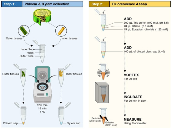 Flow chart of the determination of OTC in citrus sap phloem and xylem sap (directly without using SPE). Step 1: Collection of citrus phloem and xylem saps by centrifugation. Step 2: Determination of OTC using the fluorescence assay by mixing diluted saps (1 to 40) with Eu and citrate reagents in Tris buffer (100 mM, pH 8.5).