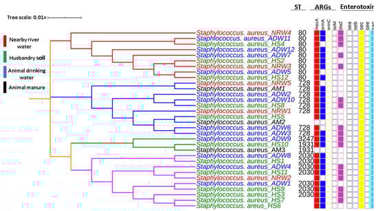 - Anjum, M.F.; Marco-Jimenez, F.; Duncan, D.; Marín, C.; Smith, R.P.; Evans, S.J. Livestock-Associated Methicillin-Resistant Staphylococcus aureus From Animals and Animal Products in the UK. Front. Microbiol. 2019, 10, 2136. [Google Scholar] [CrossRef]
