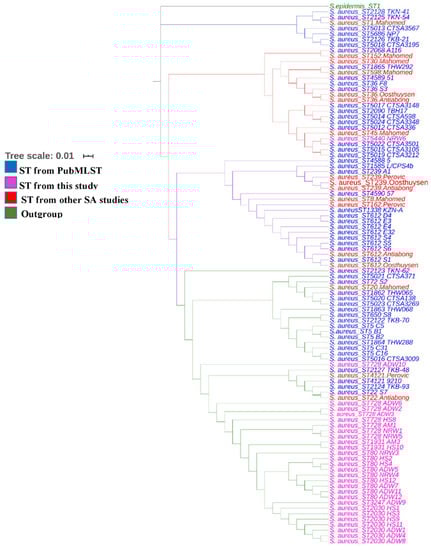 - Enright, M.C.; Day, N.P.J.; Davies, C.E.; Peacock, S.J.; Spratt, B.G. Multilocus Sequence Typing for Characterization of Methicillin-Resistant and Methicillin-Susceptible Clones of Staphylococcus aureus. J. Clin. Microbiol. 2000, 38, 1008–1015. [Google Scholar] [CrossRef]