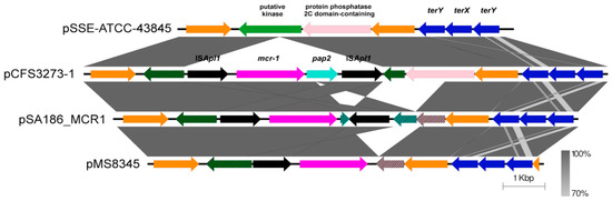 The mcr-1 resistance determinant was identified in IncHI2 plasmids pCFS3273-1 and pCFS3292-1. E. coli CFS3273 was originally isolated in 2007 in France and E. coli CFS3292 was isolated in 2010 in France; thus, they provide some of the earliest examples of mcr-1 reported in Europe. Both plasmids pCFS3273-1 (Figure 2) and pCFS3292-1 contained the tellurite resistance operon [32] located towards the distal end of the sequence.