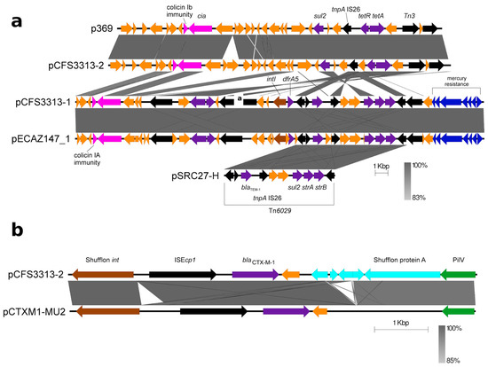 Complex AMR modules in pCFS3313-1 and pCFS3313-2. (a) Highlighted in the figure are three selected BLAST hits—plasmids p369, pECAZ147_1, and pSRC27-H. Plasmid p369 showed a higher degree of similarity with plasmid pCFS3313-2 but comparatively less similarity with plasmid pCFS3313-1, which matched closely with plasmid pECAZ147_1. An intact Tn6029 module is present in both plasmids pCFS3313-1 and pECAZ147_1. Colour scheme: antimicrobial resistance genes (purple), heavy metal resistance genes (blue), transposons and insertion elements (black), colicin resistance (pink), and integrases (brown). (b) The IncI1-blaCTXM-1 plasmid pCTXM1-MU2 shows high synteny with plasmid pCFS3313-2. The ISEcp1 module is present in both plasmids. Colour scheme: antimicrobial resistance genes (purple), shufflon genes (light blue), transposons and insertion elements (black), and integrases (brown). Other genes are represented in orange.