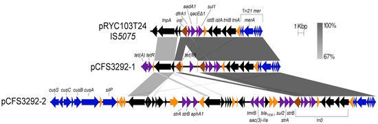 Plasmid pCFS3292-1 contained a single copy of tet(M), transposon Tn21 encoding mercury resistance, and dfrA1-aadA1-qacEΔ1-sul1 within an In0 module, which encodes resistance to trimethoprim, aminoglycosides, quaternary ammonium compounds, and sulphonamides, respectively (Figure 4). The presence of tet(M) is unusual in that it is rarely associated with Gram-negative bacteria; however, it has been reported in clinical isolates of E. coli [53]. The In0 and Tn21 mer modules comprise IS5075 and when sequence similarities between plasmids pRYC103T24, pCFS3292-1, and pCFS3292-2 were considered, conserved synteny and nucleotide sequences were noted. When compared to IS5075, additional integration of AMR-encoding genes in pCFS3292-1 and pCFS3292-2 between the intI integron and tnpA were observed (Figure 4). Specifically, in plasmid pCFS3292-2, a complex module encoding two copies of strA, strB, and aphA1 along with single copies of tmrB, aac(3)-IIa, blaTEM-1, and sul2 was present in this region. Plasmid pCFS3292-2 also contained the copper cation efflux cus-encoding cluster (silP-cusA-cusB-cusF-cusC-cusR-silE), which is similar to a recently described copper homeostasis and silver resistance island (CHASRI); however, it lacks the pco plasmid-borne copper resistance system [54].