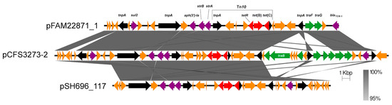Complex AMR region between plasmids pFAM22871_1, pCFS3273-2, and pSH696_117. High conservation of a complex antimicrobial resistance gene region with the presence of Tn10 in plasmids pCFS3272-2. Extensive deletion of the tra region is observed in plasmid pFAM22871_1. Colour scheme: antimicrobial resistance genes (purple), tetracycline resistance genes (red), transposons and insertion elements (black), and genes of interest (green). Other genes are represented in orange.