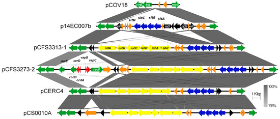 Siderophore units identified in plasmids pCFS3313-1 and pCFS3273-2. Highlighted in the figure are four selected BLAST hits—plasmids pCOV18, p14EC007b, pCERC4, and pCS0010A. The first two plasmids show a high level of similarity in the flanking regions while the latter two show similarity across the siderophore containing units along with the flanking regions. Colour scheme: siderophore (yellow), metal transporters (blue), transposons and insertion elements (black), toxins/antitoxins (red), and genes of interest (green). Other genes are represented in orange.