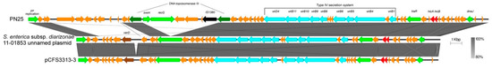 Of the three plasmids contained in E. coli CFS3313, plasmid pCFS3313-3 was of interest as it contained a full T4SS. The latter are protein complexes that are located within the bacterial cell envelope. Gram-negative bacteria use these systems to translocate a variety of virulence factors into the host cell. T4SSs are also known to mediate horizontal gene transfer, which in turn, facilitates the adaptation of the bacterium to a specific environmental niche, and which can also contribute to the dissemination of antibiotic resistance-encoding genes among bacteria [65]. BLAST comparative analysis of plasmid pCFS3313-3 identified IncX4 type plasmid PN25 [42] along with an unnamed plasmid from Salmonella enterica subsp. diarizonae strain 11-01853 isolated from a fatal septicaemia case [66] (Figure 7).