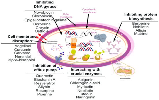 Phytochemicals show promising results in overcoming the resistance development of resistance in bacterial pathogens and combating bacterial infections. These compounds can restore the clinical application of conventional antibiotics by increasing their potency and avoiding the development of resistance. The antibacterial properties of phytochemicals are related to chemically interference with the function or synthesis of vital components and circumventing the mechanism of antibacterial resistance. Different mechanisms have been mentioned in antibacterial actions that inhibit bacterial cell-wall biosynthesis and cell membrane destruction, inhibiting bacterial protein biosynthesis, DNA replication and repairing, and metabolic pathways [33,34]. In addition, different mechanisms are involved in bacterial resistance to an antibiotic, such as overexpression of the efflux pumps, destroying the antibacterial agents, structural modification of porins, and modification of antibiotics [33,35]. Therefore, inhibition of them is an integral part of combating antibiotic resistance [3]. Phytochemicals based on their chemical structures and properties could exhibit antibacterial actions via one or more of these mechanisms [4]. Based on structures, they are categorized into major groups of alkaloids, tannins, carbohydrates, and glycosides, terpenoids, flavonoids, steroids, and coumarins [36]. These compounds have particular clinical value because their bioactivity generally does not lead to resistance. Some important plant-derivative compounds with antibacterial activities and their mechanism of action are illustrated in Figure 1.