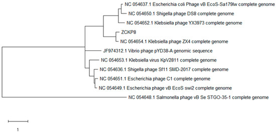 Figure 2. Phylogenetic relationships between ZCKP8 phage and BLASTN top-matched phages. The closely related phage is Klebsiella phage ZX4 (GenBank Acc. No. NC 054654.1).