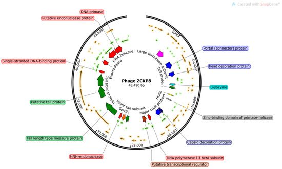 Figure 3. The ZCKP8 genome map. Only CDSs with known functions are labeled in their positions. Those representing hypothetical proteins are not labeled.