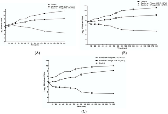 Figure 4. These plots represent the in vitro activity of phage ZCKP8 at 37 °C. These panels show bacterial counts and phage titers of K. pneumoniae KP/15 infected with ZCKP8 at (A) MOI of 0.1; (B) MOI of 1; (C) MOI of 10. MOI: Multiplicity of infection; CFU: Colony-forming unit; PFU: Plaque forming unit.