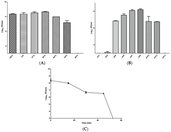 Figure 5. These diagrams represent the stability of phage ZCKP8 at different temperatures (A), at different pH values (B), and under UV lamp (C). PFU: Plaque forming unit.