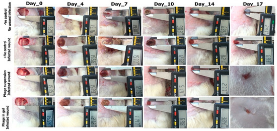 The images shown in Figure 6 represent the treated and nontreated wounds with the phage on zero day, 4th, 7th, 10th, 14th, and 17th post-surgery.