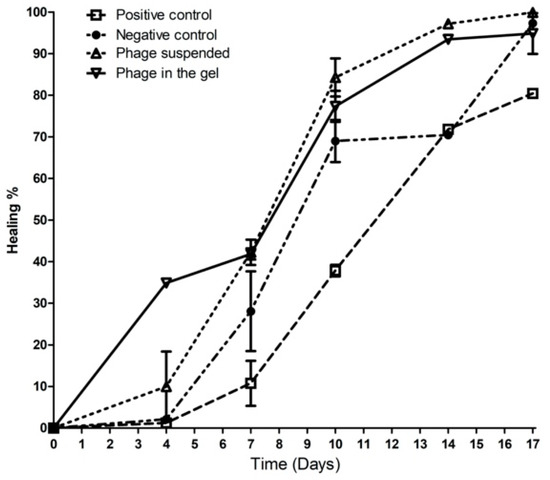 Starting from the 7th day, the two treated infected groups with phage suspension and phage impeded in gel showed a reduction in the wound area, where the wound closure percentages were 32.42% and 37.84%, respectively. While, the wound healing percentage was 15.3% and 0% in the negative control group and the positive control group (Infected wound without treatment), respectively. On the 17th, the treated groups with phage suspension and gel reached a maximum of 99% of wound closure, where the negative control group reached 97.43% while, the positive control group showed a minimum of 79.76% wound closure, as shown in Figure 7.
