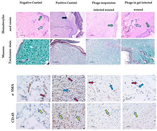 Figure 8. Histological analysis of wounded skin section from different rat groups at the 17th-day post wounding. Hematoxylin and eosin (H&E) staining, ×100, Masson Trichrome stain, ×100 and IHC by using α-SMA, and CD-45, ×400 showed in the non-infected, non-treated group complete skin wound healing and remodeling, the infected non-treated group shows epidermal ulceration and crust formation, early inflammatory phase of wound healing and a minimal amount of fibrosis, denoting delayed wound healing. While the infected groups treated with phage suspension and phage embedded in gel show, a complete wound healing and remodeling with adequate amount of fibrosis and epidermal re-epithelialization in the latter group denoting complete maturation of the healing process.